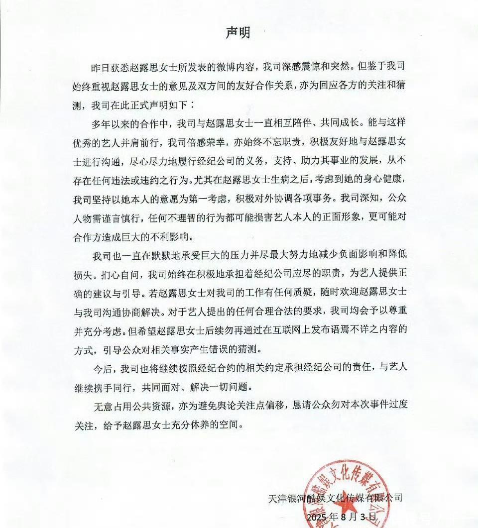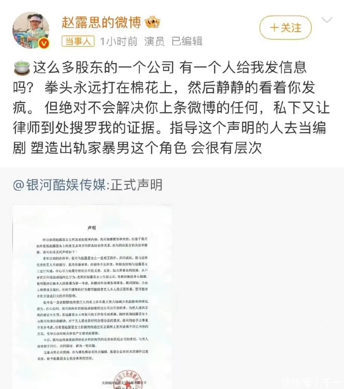 可以看到,当时赵露思是和银河酷娱已经处于撕破脸的状态。而银河酷娱也并没有对赵露思有什么动作丰汇投资,反而是赵露思要不就是公开骂银河酷娱,要不就是注销微博,抖音直播回应等,要知道艺人明面上这么说公司,怎么着也得被制裁。但是银河酷娱仅仅发了个不痛不痒的声明,并始终坚持和赵露思是友好合作关系。