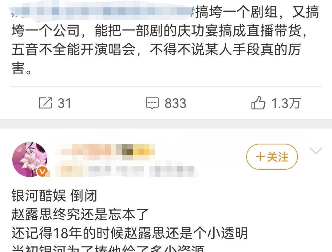说实话,感觉不只疯宝,很多人看了应该都只认识赵露思吧?其他人也都在电视剧偶尔见过,但是就是不认识。完全可以说银河酷娱真的是靠赵露思的流量在支撑着。然后有网友说当年赵露思是个小透明,因为公司给的资源才火起来,那其他那些艺人公司不给资源吗?给了为什么几乎看不到他们的代表作?其实就像杨幂,刘亦菲等人,真的不是看公司的,一个演员咖位能升上去完全看个人的,演技好或者长得耐看的哪怕演个配角,或者只是露面被大众所认可就能火,放在哪个公司都一样,只是早火和晚火的区别。如今赵露思工作室主页也已经取消了银河酷娱的标识。