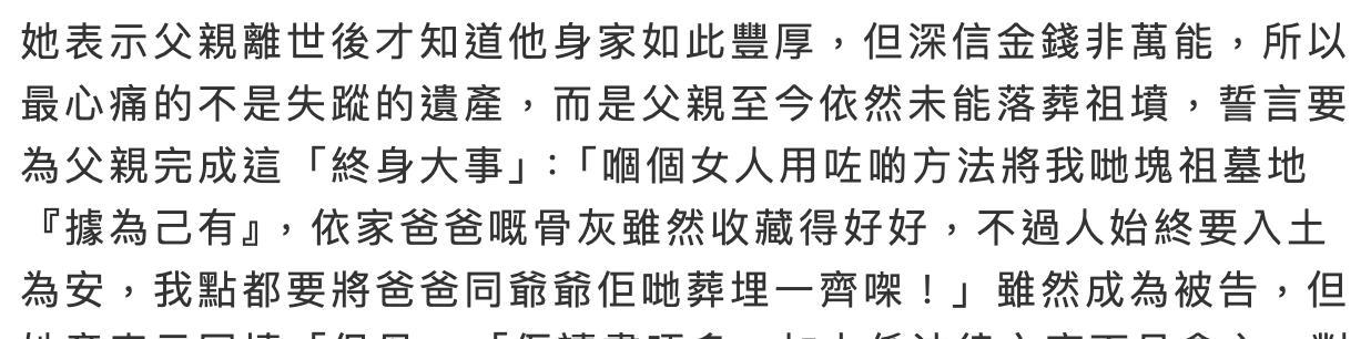 叶璇称直到父亲离世,她才知道父亲身价如此丰厚,不过她对丰厚的遗产毫无兴趣,而在意的是父亲至今仍然不能下葬。叶璇表示父亲的保姆用了手段将叶家祖坟的地契占为己有,导致父亲离世之后不能下葬,虽然骨灰仍然安放得很好,但是还是要入土为安,那么接下来她要做的就是抢回叶家的祖坟地契。至于其他方面的财产,叶璇称在父亲临终前,父亲就交代了身后事,而且还给了自己很多东西,不过叶璇已经把自己所得的那一份遗产给了继母与弟弟,她觉得继母与弟弟的遭遇很惨,被保姆离间了感情,而自己只要一些有纪念价值的东西。